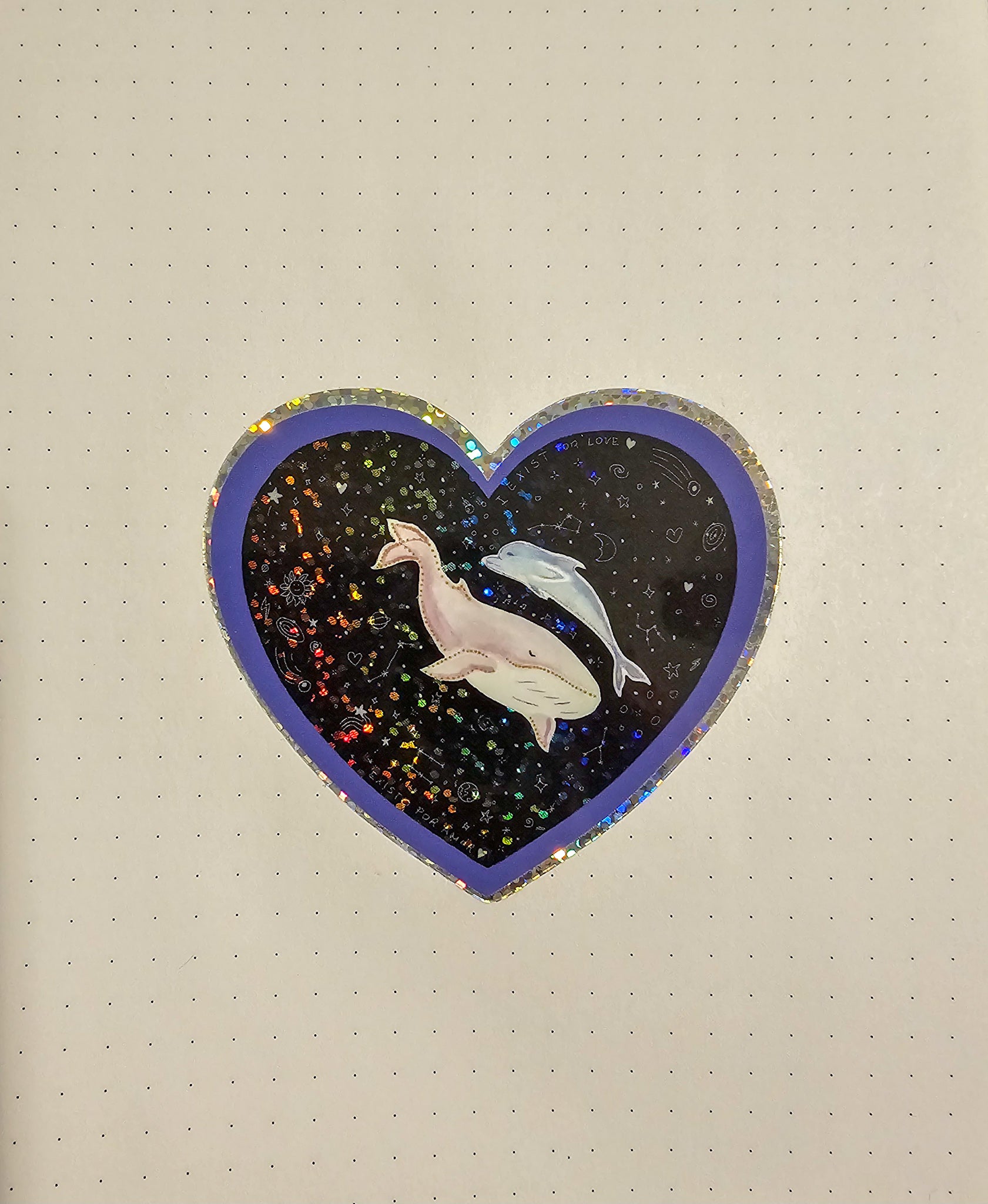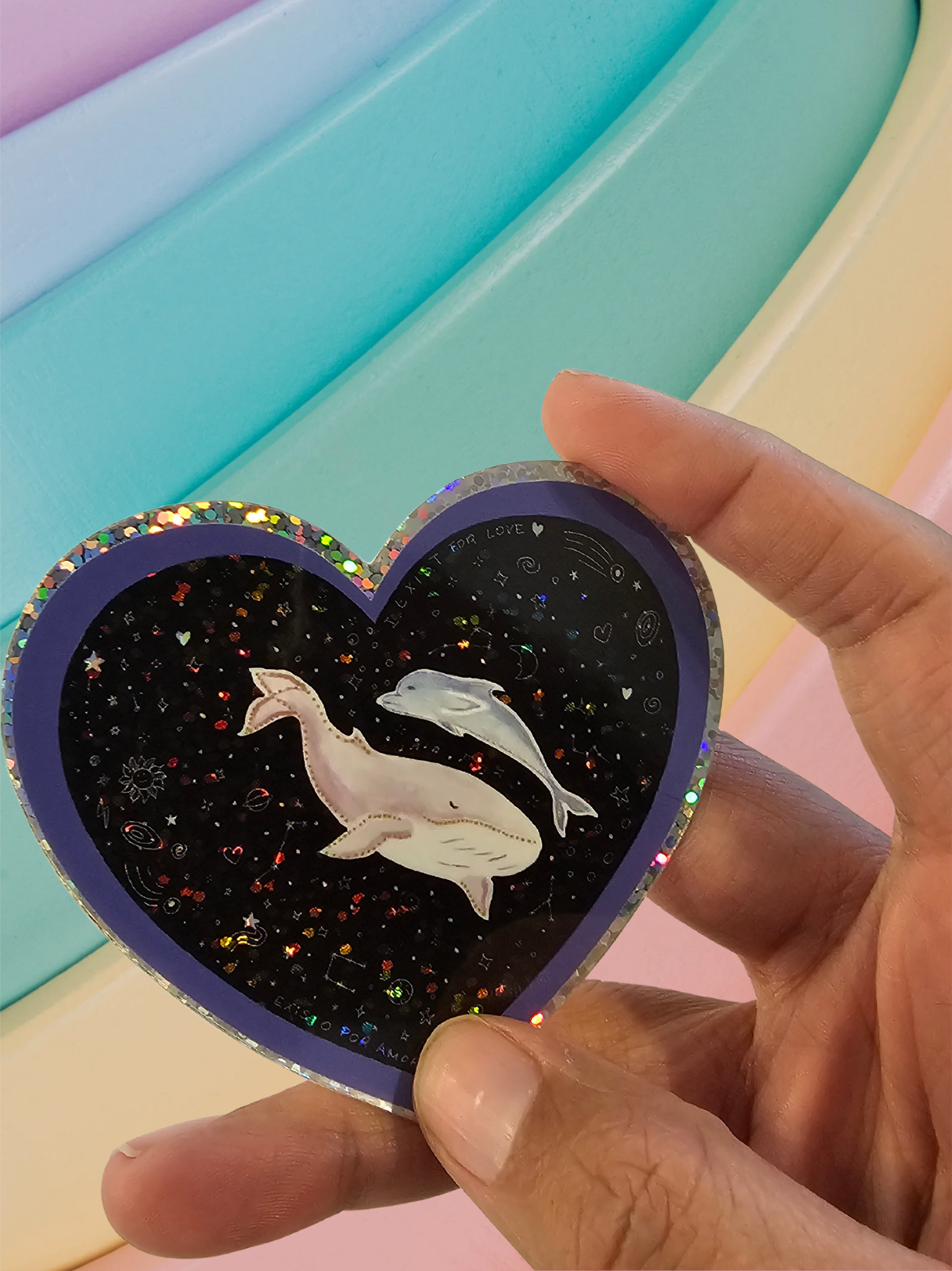 Dive into the cosmos with this enchanting holographic vinyl sticker. Shaped like a heart and shimmering with rainbow sparkles, it features two ethereal whales swimming together through a star-filled galaxy. A magical design that celebrates love, wonder, and the mysteries of the ocean and the stars.